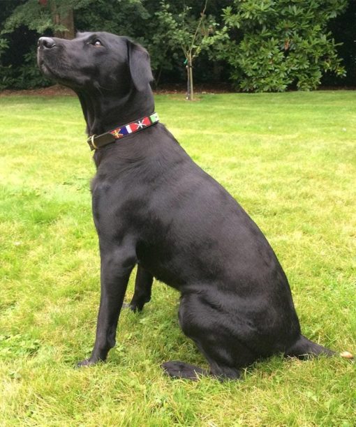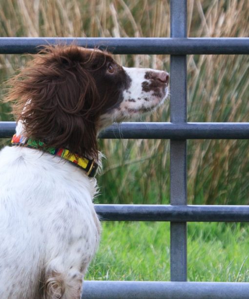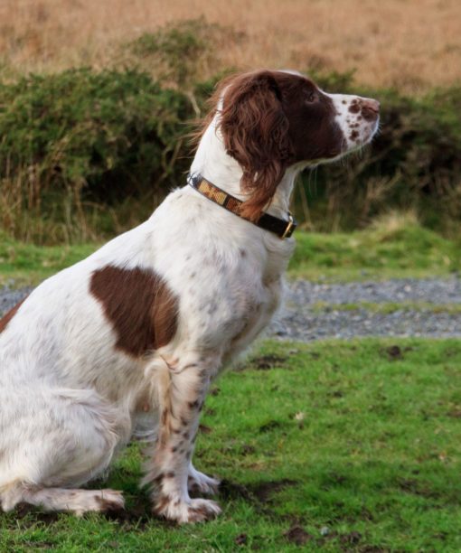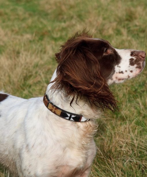 A fine collar suitable for a Spaniel sized dog. Available in a variety of sizes and widths. Patterns vary.